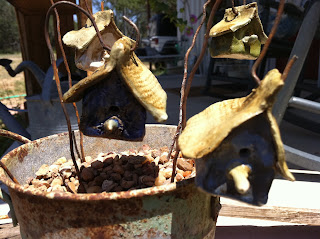 Tiny bird houses on rusty wire. A perfect decoration for potted plants.